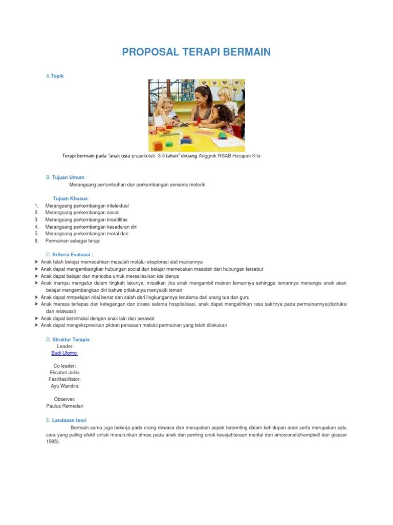 Tumbuh kembang dan terapi bermain pada anak. Contoh proposal terapi bermain proposal terapi bermain âular tanggaâ di ruang bermain anak rsup sangglah denpasar pokok pembahasan : Memberikan contoh kepada anak untuk menggambar sesuai keinginannya dan dibimbing dan didampingi oleh fasilitator. Wonosari sebanyak 24 anak tiap bulannya dan mengalami . Proposal satuan acara penyuluhan (sap) terapi aktivitas bermain pada anak di rumah sakit. Terapi bermain adalah bentuk konseling atau psikoterapi dengan menggunakan permainan guna mengamati serta mengatasi berbagai masalah kesehatan . Membantu anak mengungkapkan perasaannya dalam menghadapi kecemasan dan ketakutan terhadap sesuatu yang tidak menyenangkan baginya. Beri pujian selama melakukan proses . Permainan pada anak sakit atau lelah, dilakukan pada cuaca buruk atau hujan. Menyelesaikan proposal penelitian yang berjudul "pengaruh terapi bermain. Disusun oleh tim anak : Terhadap perilaku kooperatif anak selama tindakan prosedur invasif:. Bermain menurut hughes, seorang ahli perkembangan anak dalam.